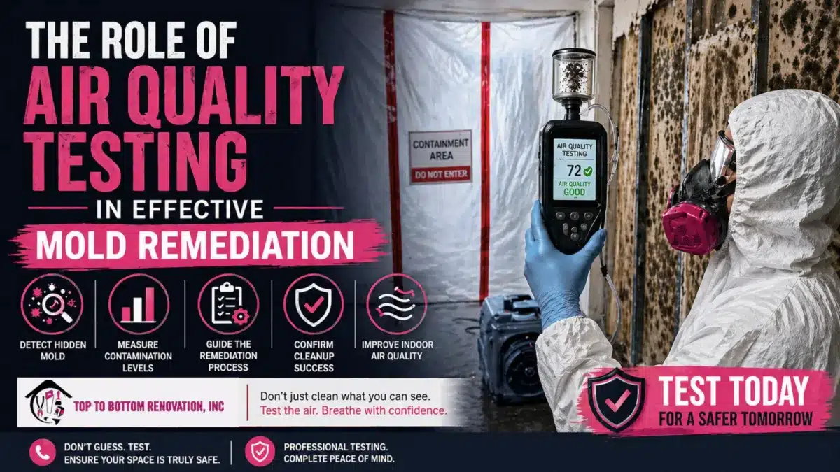 Air quality testing detects airborne mold spores, identifies contamination levels, and helps professionals plan effective remediation. It ensures hidden mold is addressed and confirms whether indoor air is safe after cleanup is completed.